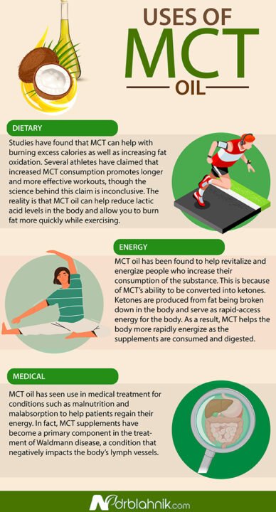 • Medical: MCT oil has seen use in medical treatment for conditions such as malnutrition and malabsorption to help patients regain their energy. In fact, MCT supplements have become a primary component in the treatment of Waldmann disease, a condition that negatively impacts the body’s lymph vessels.