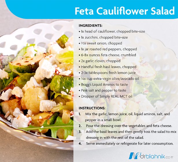If you are looking for ways to spruce up the salad a bit, there are ways to prepare the ingredients to boost the overall flavor of the salad. You can roast or broil the cauliflower, onion, and zucchini and then drizzle them with olive oil, salt, and pepper. After you have seasoned your cooked vegetables to your liking, add the red peppers, dressing, basil, and feta to complete the salad, which, if done correctly, should result in an even tastier salad than you would otherwise get with this recipe.